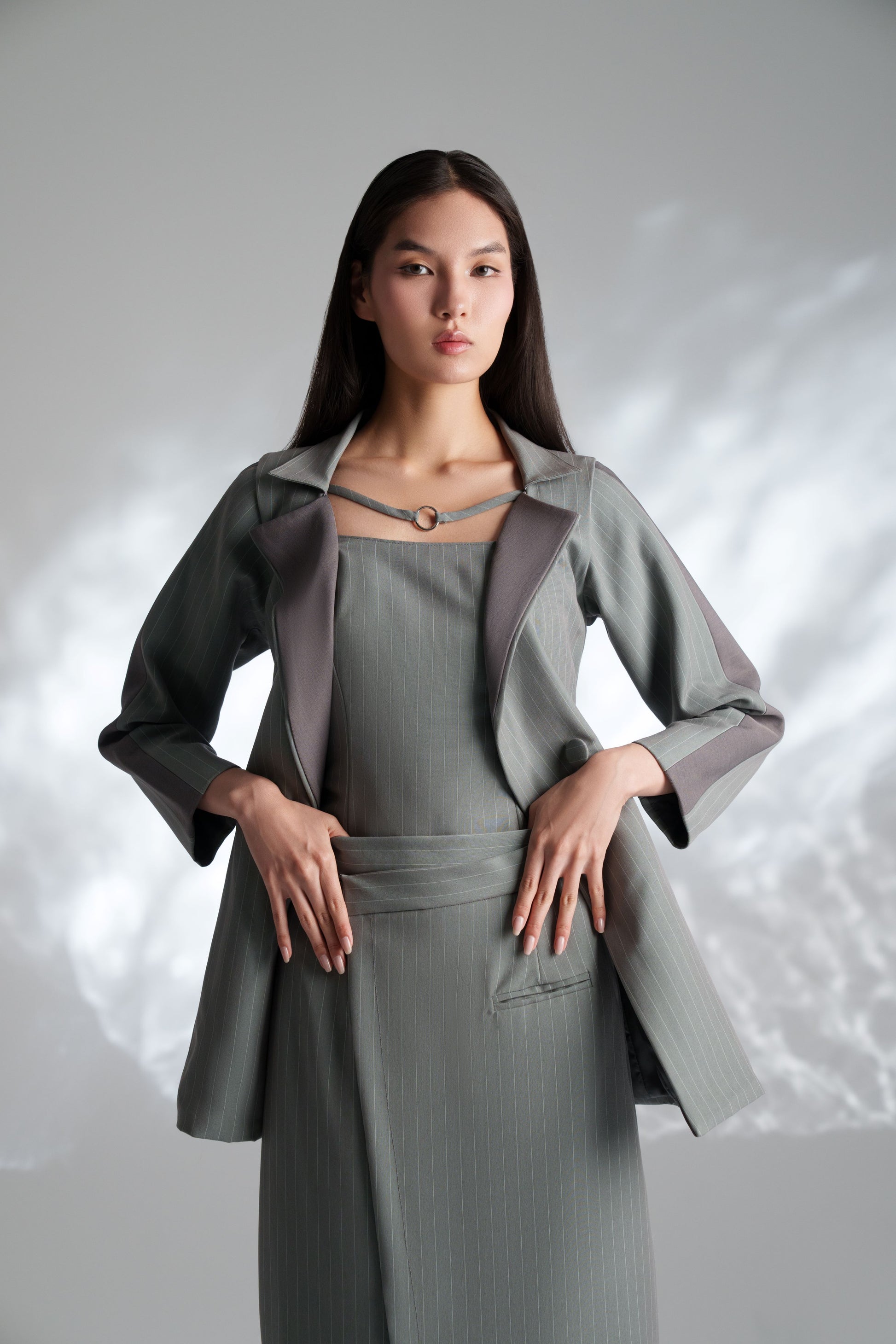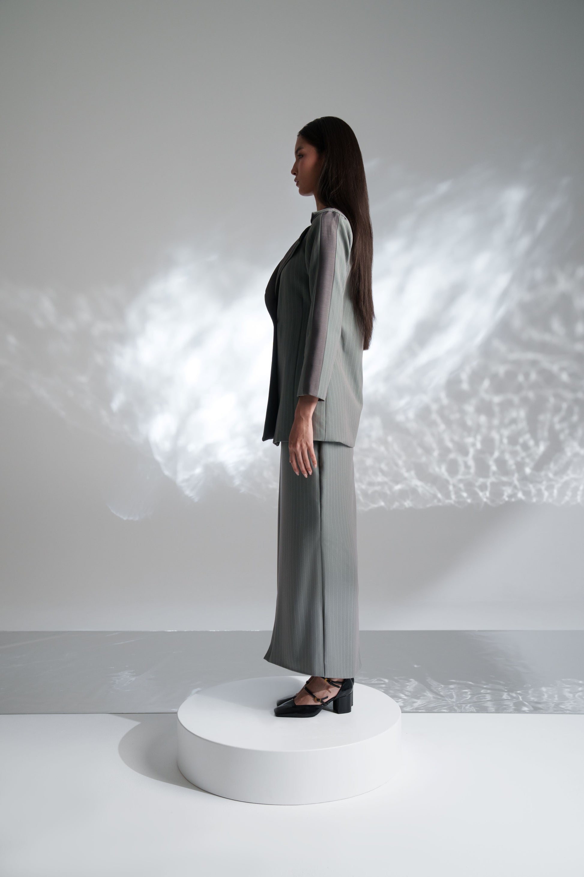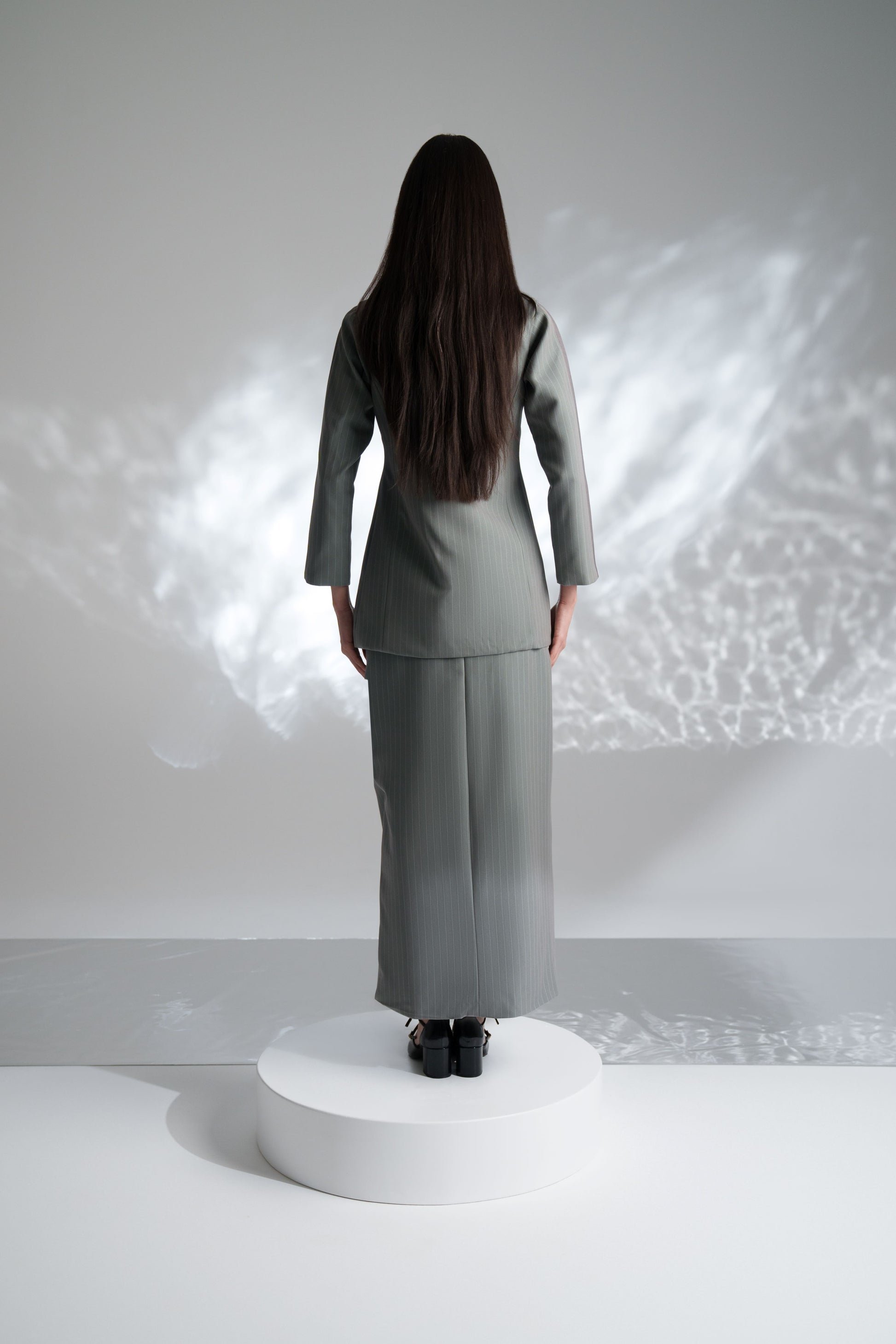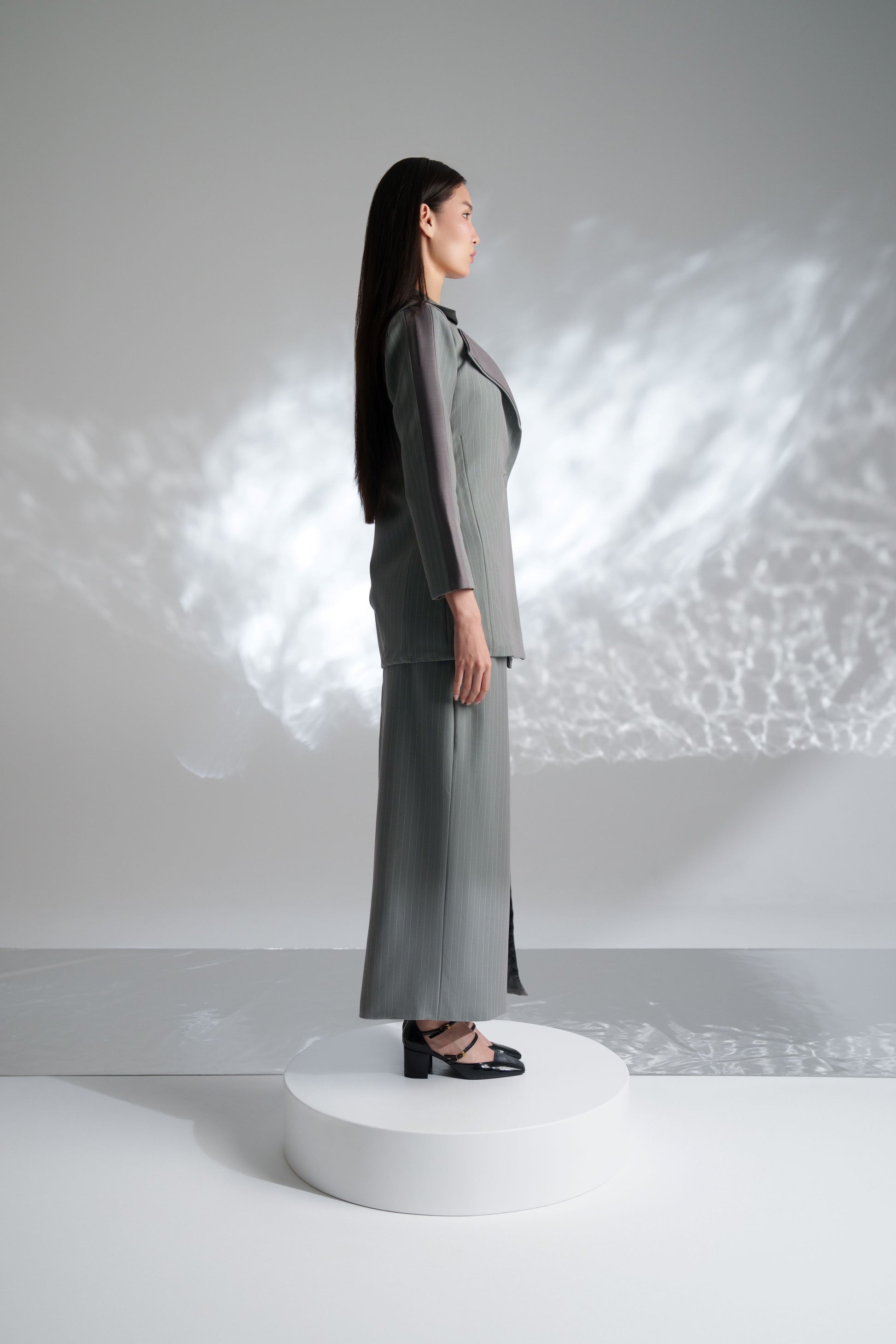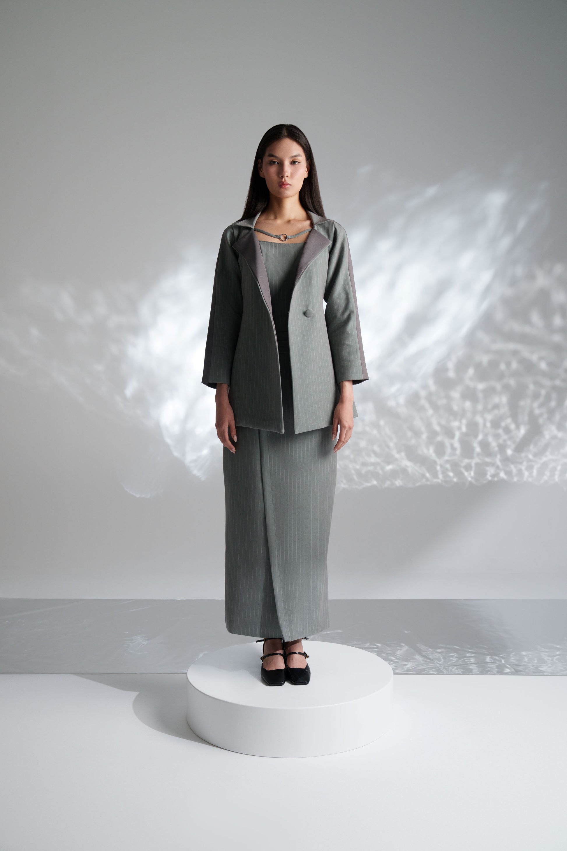 Three pieces set comes in long wrap design skirt, sleeveless top & long sleeved blazer