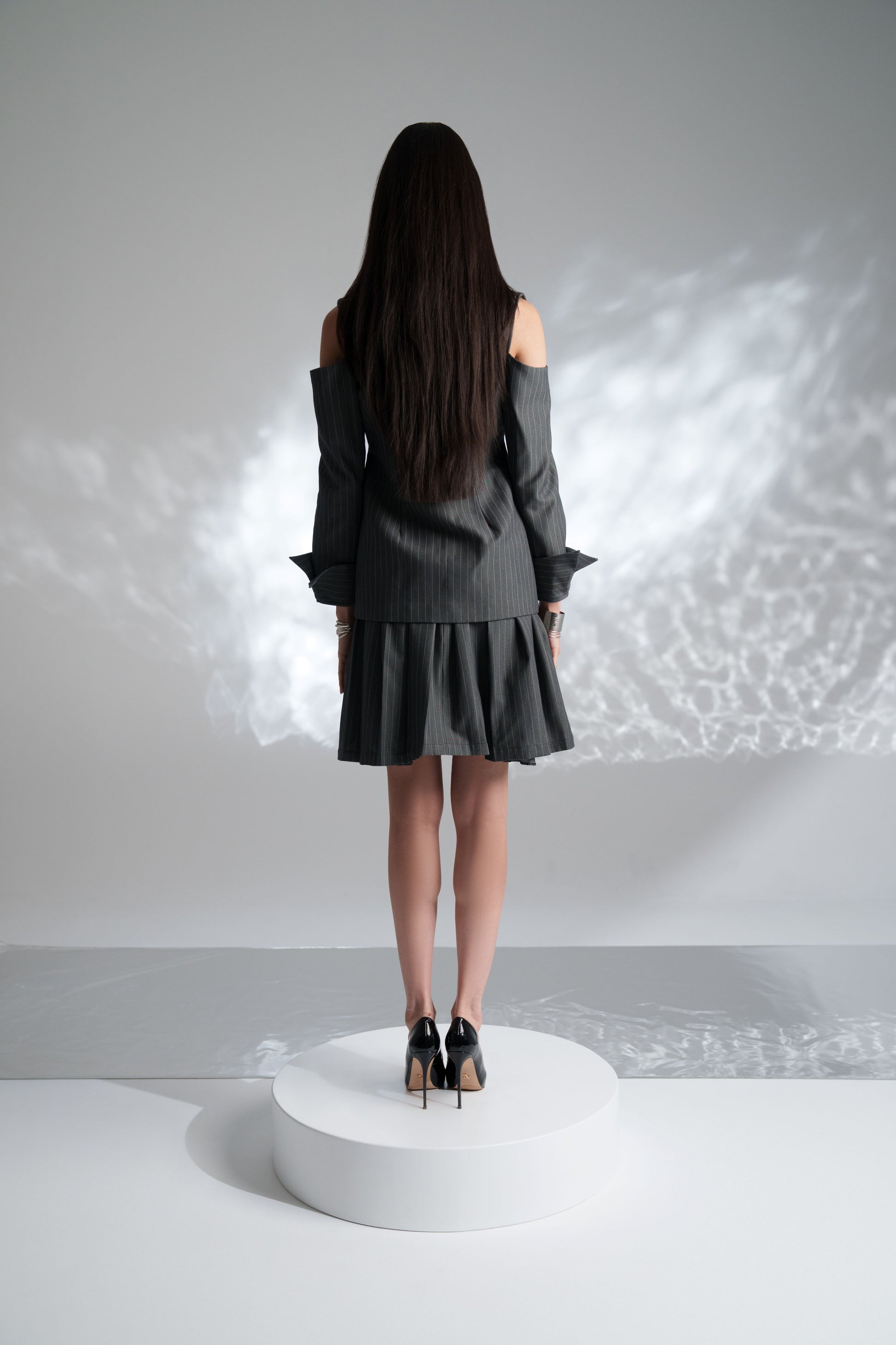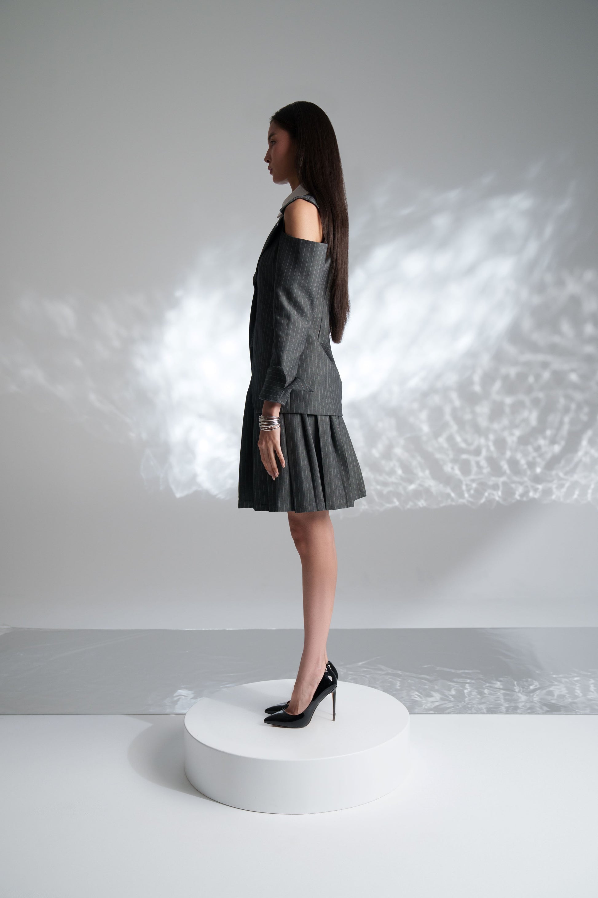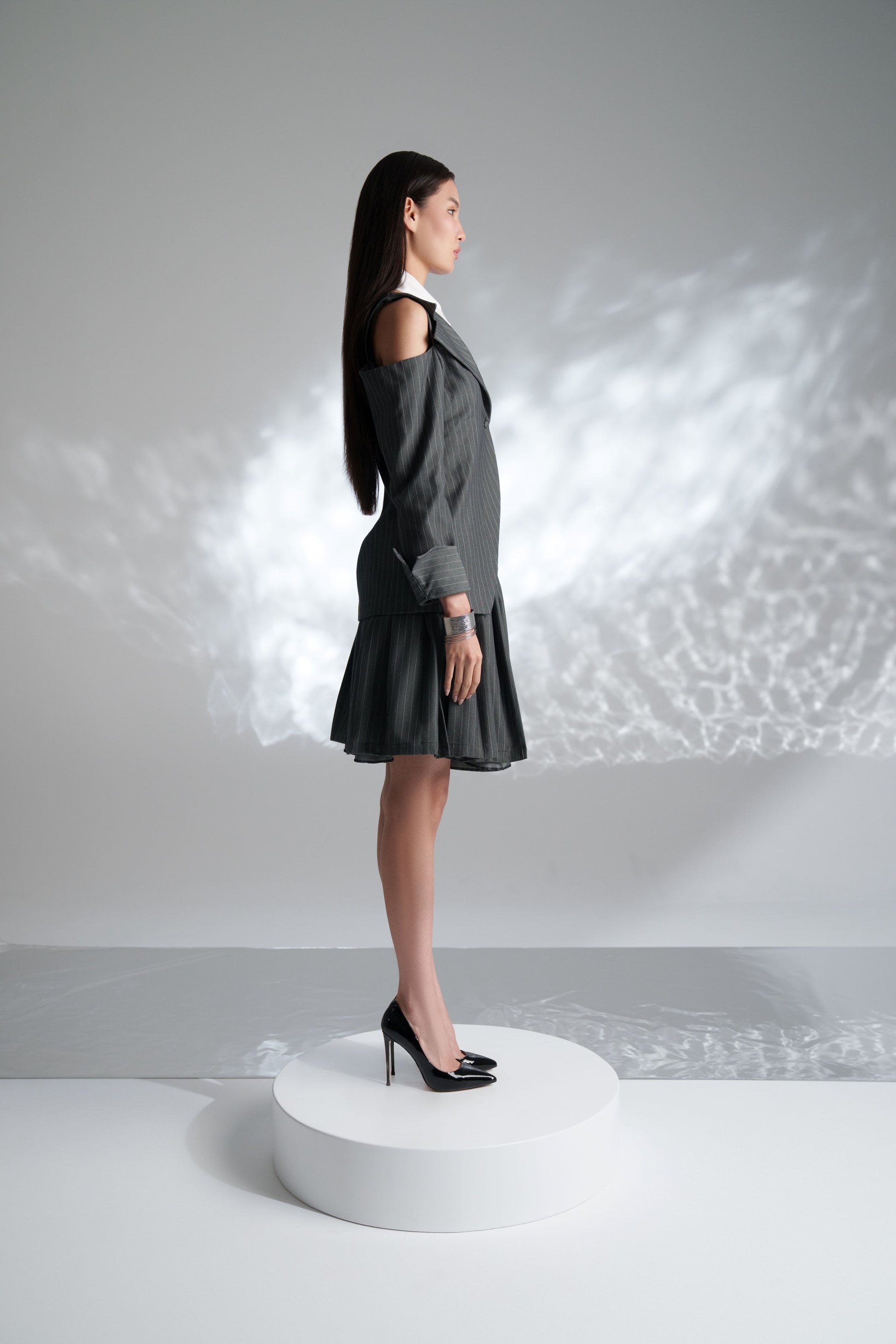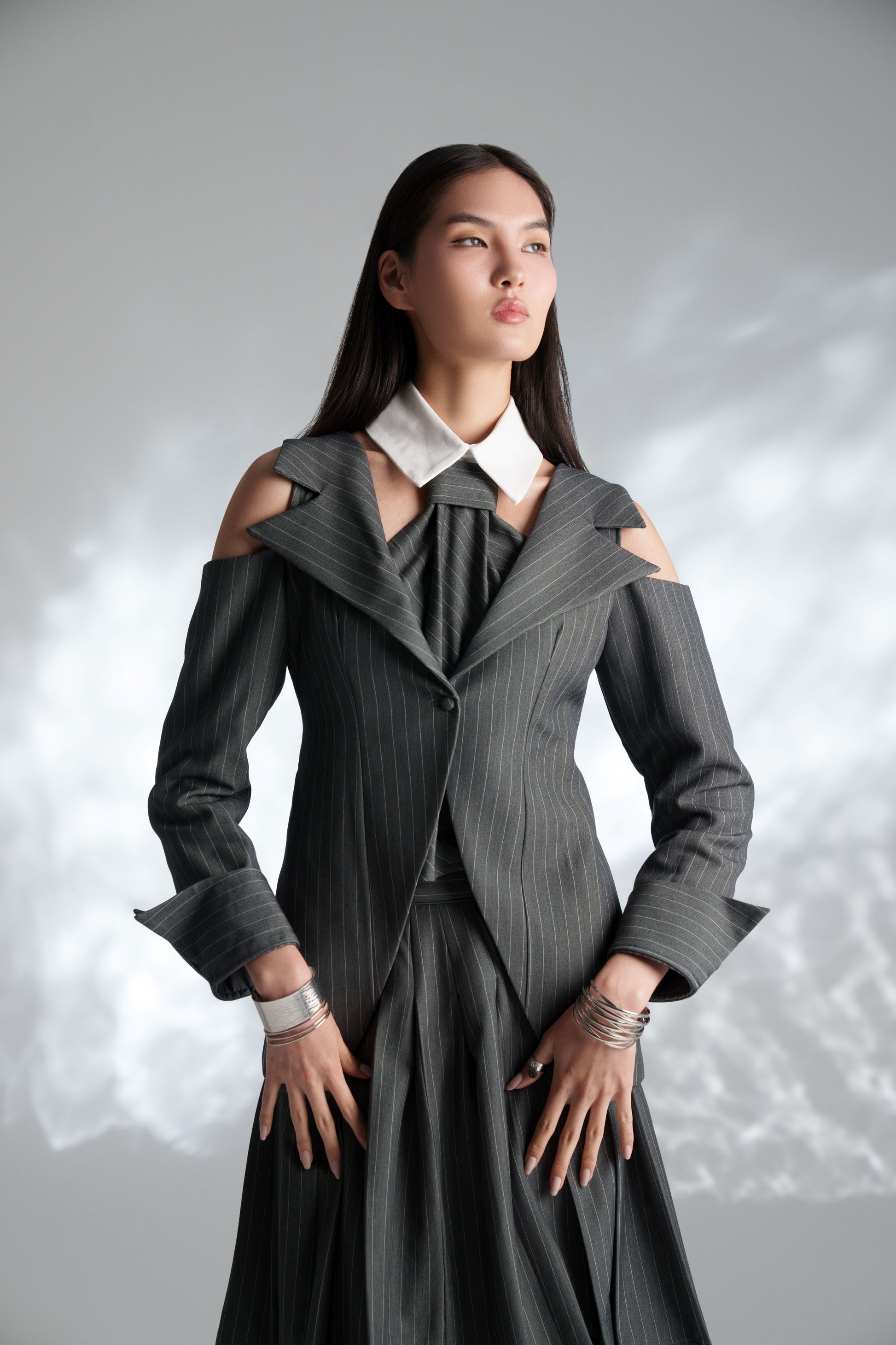 Three pieces set comes in statement collar sleevless top, long sleeved blazer & short  flowing skirt