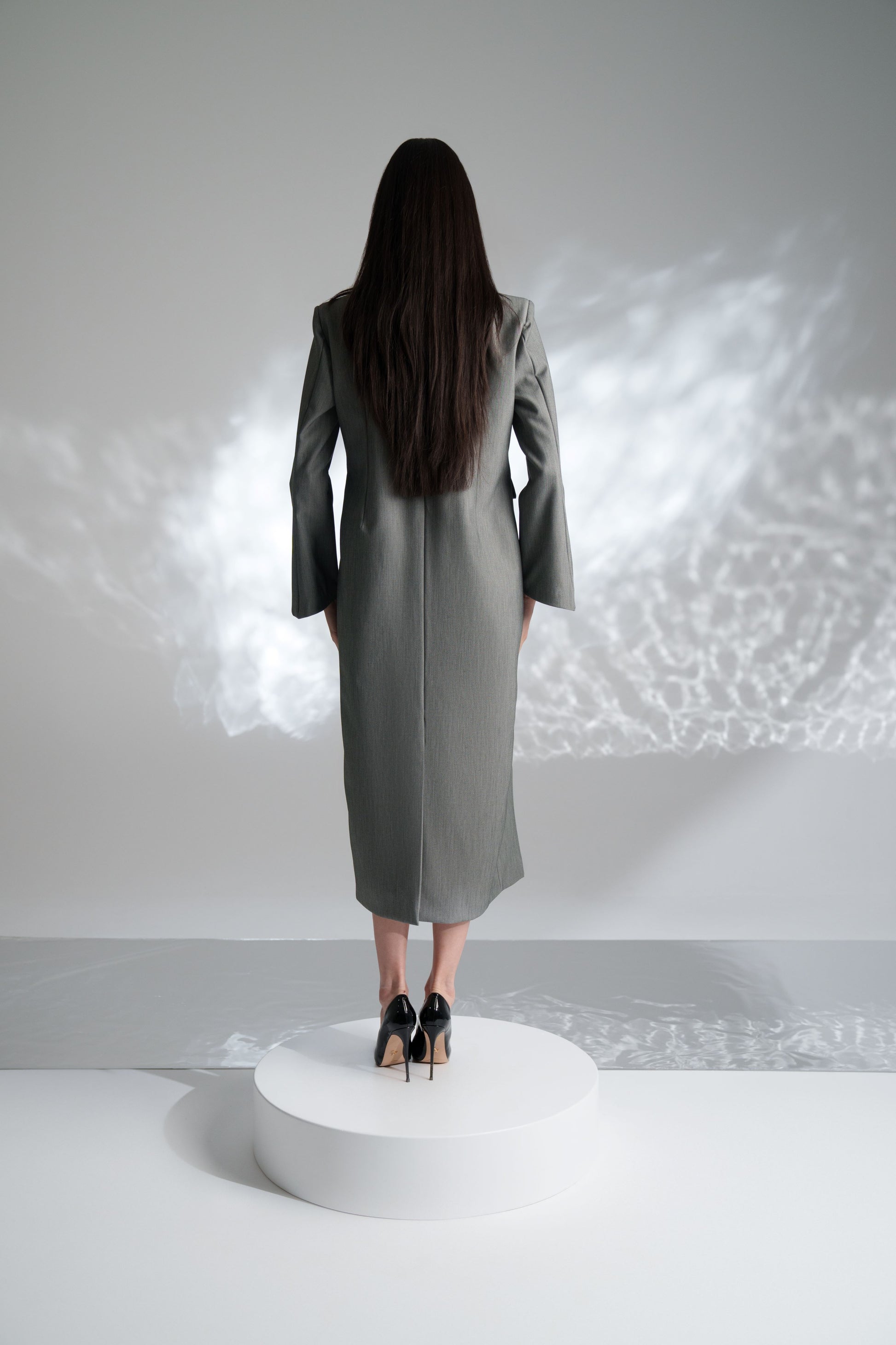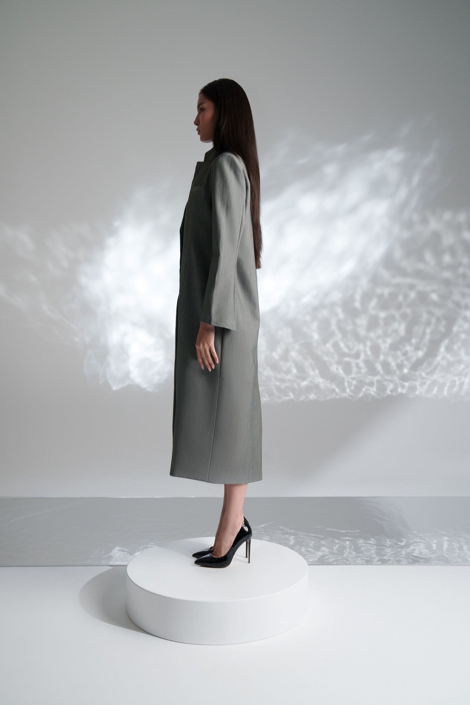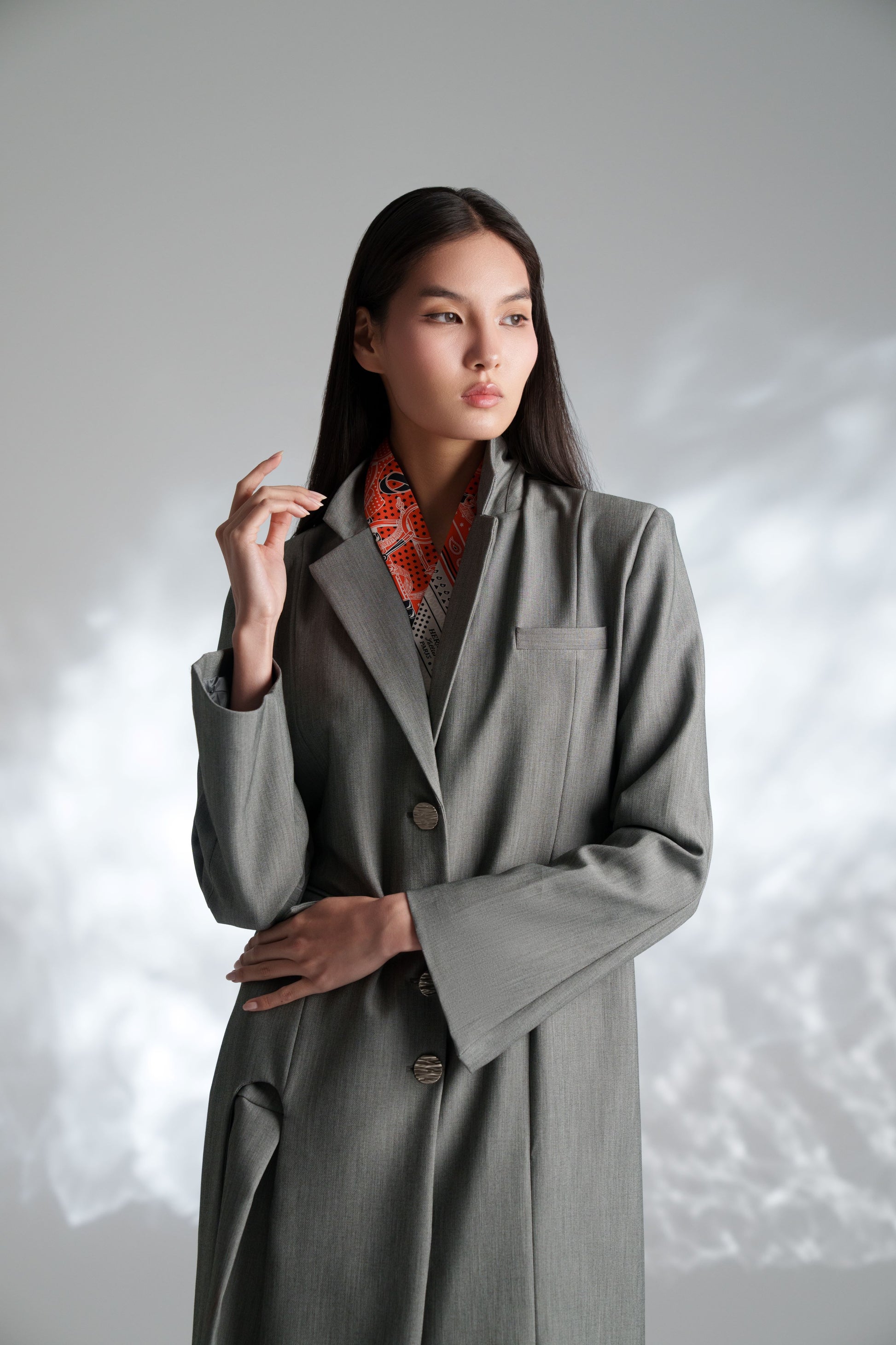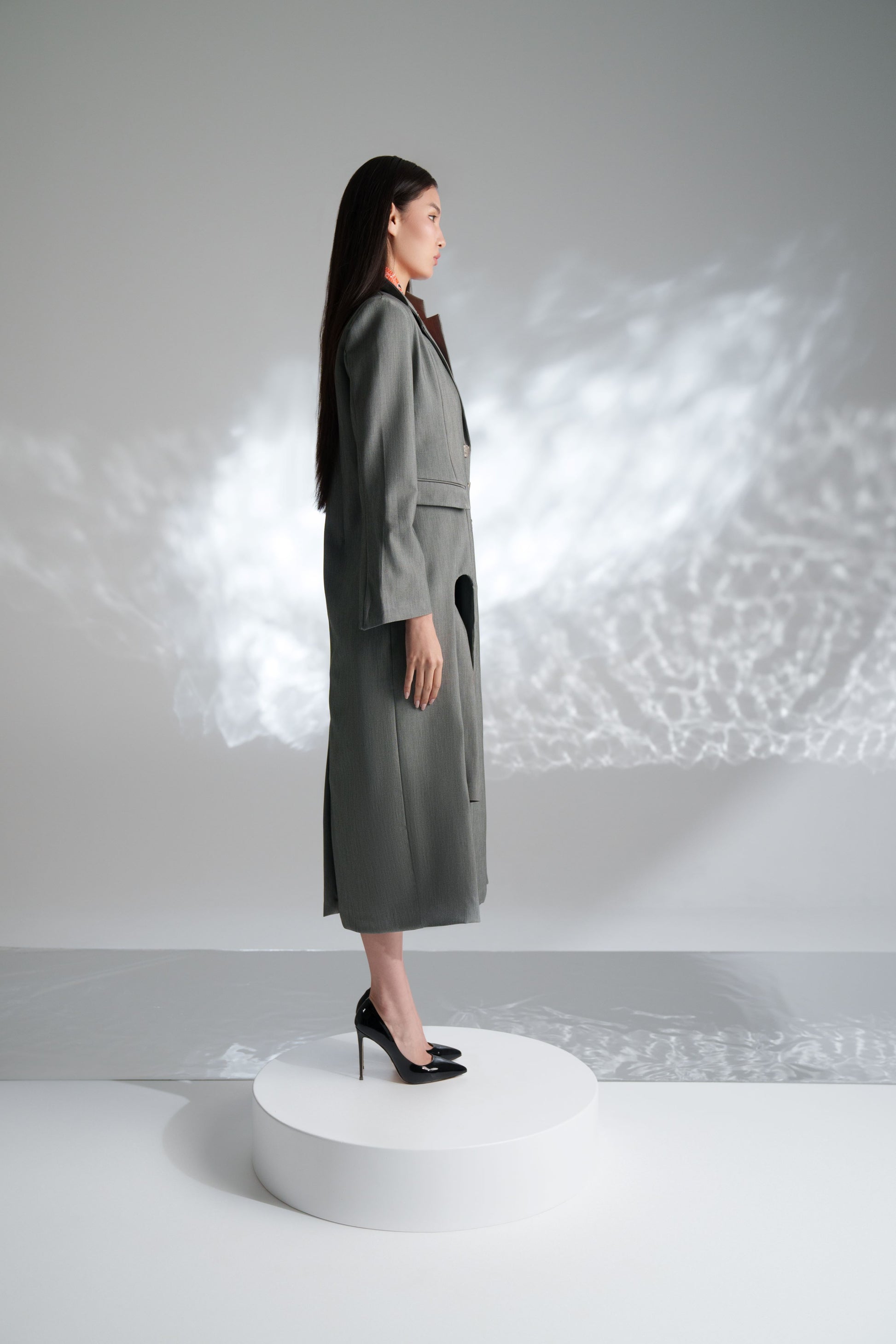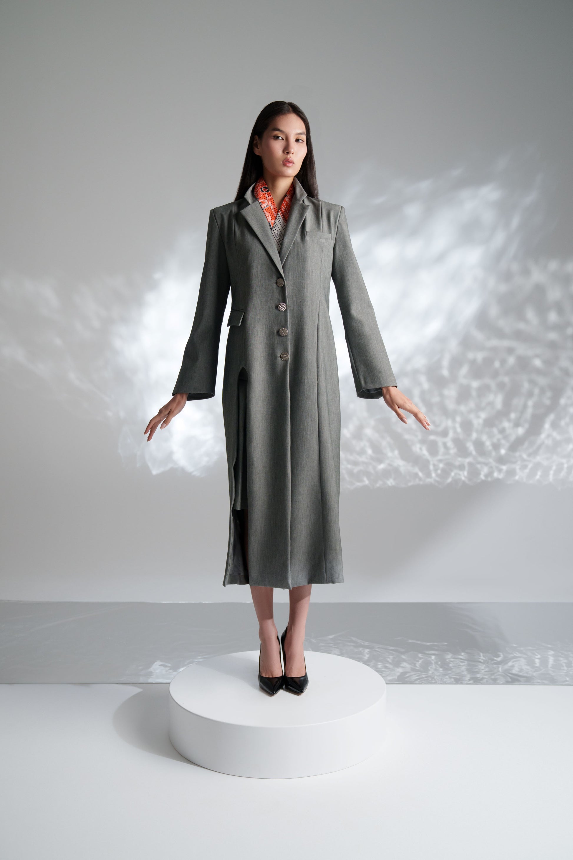Three pieces set comes in statement collar sleevless top, long sleeved blazer & short  flowing skirt